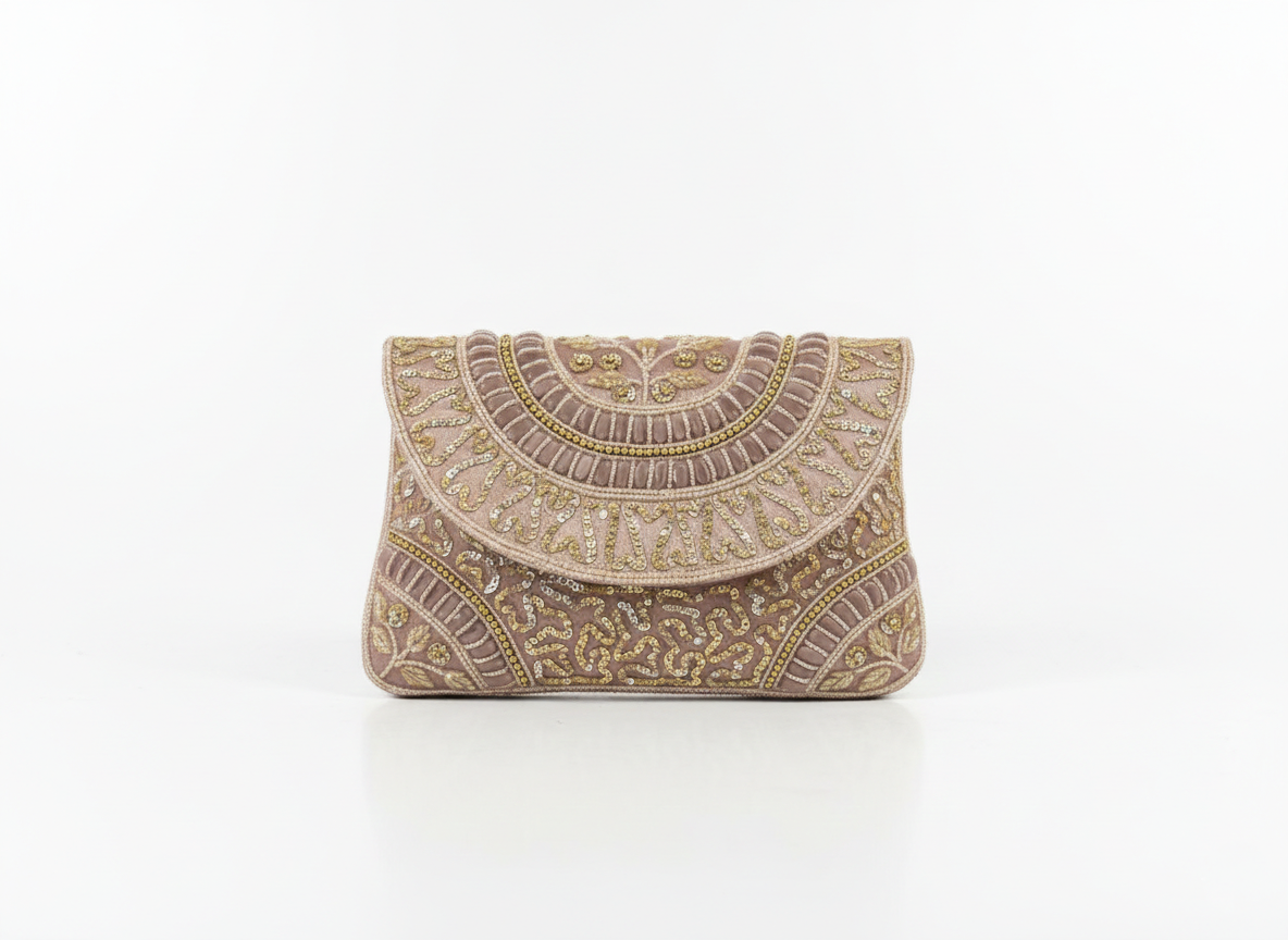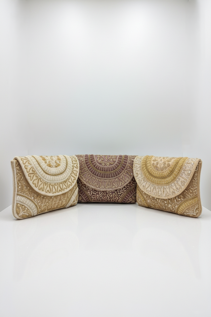 This exquisitely handcrafted embroidered clutch will add an element of timeless sophistication to your special occasion outfit. The intricate patterns, combined with the delicate detailing of this unique clutch, make it suitable for any special occasion such as weddings, festivals, or formal events.The structured envelope style of this clutch creates an elegant silhouette that will enhance any clothing combination. The inside of this clutch has enough space for all of your daily items such as your cellphone, cash, cards, and makeup items.The detailed embroidery on this clutch, along with many other color variations available, will look fantastic when paired with bridal or ethnic clothing outfits.Whether you are attending a wedding as a bride, bridesmaid, or guest, this clutch will add the touch of elegance you're looking for to complete your outfit.